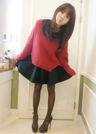공개된 조현영 다이어트 사진 속 조현영은 검은색 원피스와 빨간색 니트를 입고 귀여운 포즈를 하고 있다.