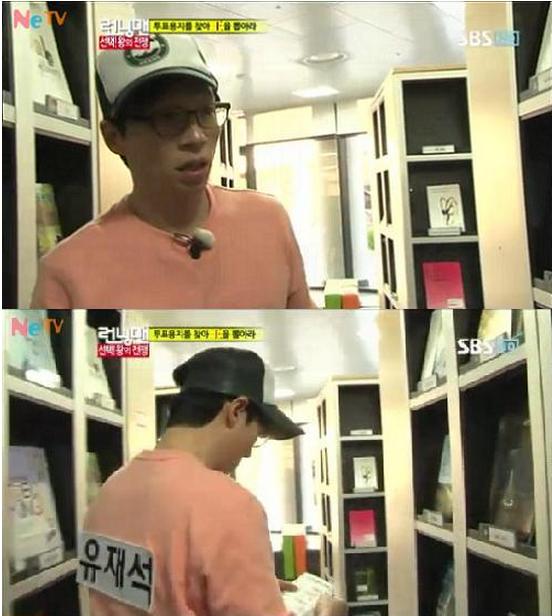 유재석이 SBS ‘일요일이 좋다-런닝맨’ 방송 중 도서관에서 책이 손상되지 않게 배려하는 매너를 선보인 것.