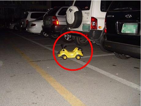 해당 무개념 주차매너 사진에는 유아용 장난감 자동차가 주차선을 무시한 채 주차되어 있다.