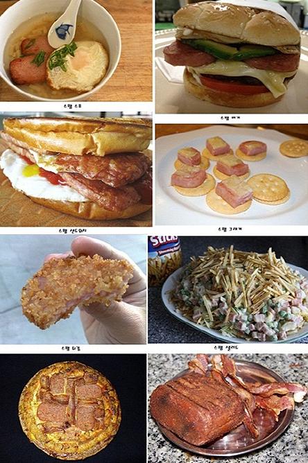 공개된 사진 속에는 스팸 스프, 스팸 버거, 스팸 샌드위치, 스팸 크래커, 스팸 튀김, 스팸 샐러드, 스팸 피자, 스팸 바비큐 등 상상하기 쉽지 않은 기발한 요리들이 등장하고 있는 것.