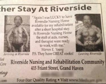 공개된 '아무도 안 속을 광고' 게시물은 외국의 어느 요양원 광고를 캡처한 것으로, 치료시설이 매우 좋아 빠른 시일 내에 건강을 회복한다는 광고다.