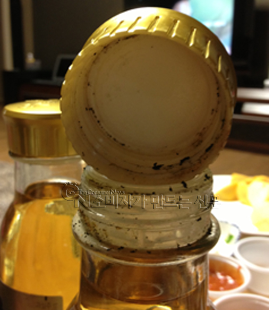 지인들과 오랜만에 만나서 족발에 술 한잔하려고 따서 한잔 마셨는데 맛이 이상하더군요. 그래서 내용물을 보니 뭔가 둥둥 떠다니더군요. 혹시나싶어 다른 병 뚜껑을 보니 시커먼 곰팡이처럼 보이는 이상한 이물질이 덕지덕지...
