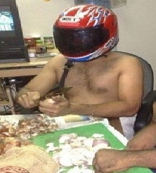 공개된 사진 속에는 두 남성이 상의를 탈의 하고 양파를 썰고 있다. 특히 헬멧을 착용하고 양파를 썰고 있는 모습이 네티즌을 폭소케 했다.