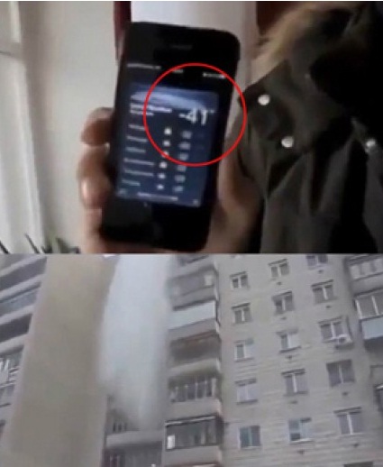 영상 속 한 남자는 스마트폰으로 날씨가 영하 41도임을 인증한 뒤 끓는 물을 아파트 베란다 밖으로 뿌렸다.