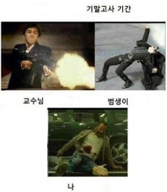 ‘기말고사 대처 자세’ 사진에는 액션영화에 등장하는 여러 장면이 캡처돼 담겨있다. 먼저 인정사정없이 기관총을 발사하는 남자는 ‘교수님’으로, 총알을 재빠르게 피하는 사람에게는 ‘범생이’라는 타이틀이 붙은 모습이다.