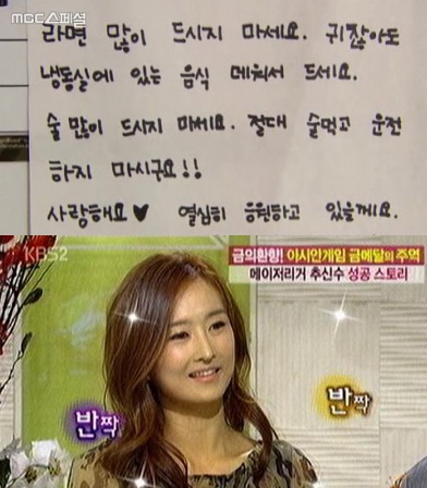 추신수 아내 공개 사진을 접한 네티즌들은 "과거에도 지금도 미모가 여전하다", "미모 만큼 손글씨에서도 착한 마음씨가 느껴진다", "추신수는 아내의 말을 좀 더 잘 들었어야 했을 듯" 등의 반응을 보였다.(사진-MBC-KBS 방송 캡처)