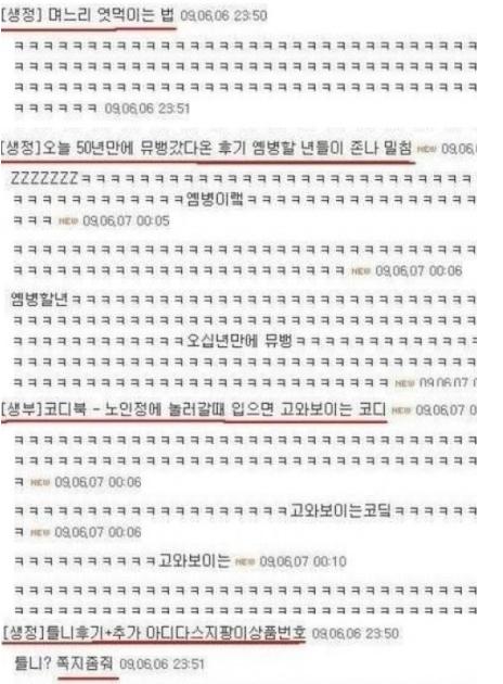 50년 뒤 네티즌들의 패러디물에서는 '영감 말고 울 밑집 사는 노인네가 좋아. 어쩌지', '며느리 엿먹이는 법', '틀니후기+추가 아디다스지팡이 상품번호', '실버타운 후기 有', '설날때 손주한테 용돈 안주고 넘어가는 법', '코디복-노인정 놀러갈 때 입으면 고와보이는 코디', '오늘 50년만에 뮤뱅 갔다온 후기', '며느리 구박하다가 아들한테 쫓겨난 후기' 등으로 다채로운 내용이다.