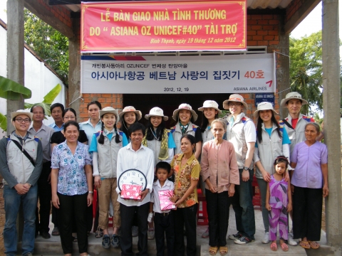 아시아나항공 캐빈승무원 봉사단체인 오즈유니세프 회원들은 19일(현지시간) 베트남 남부의 빈민지역인 번쩨성에서 ‘사랑의 집’ 40호 준공식과 빈탄 초등학교 급수탱크 및 화장실 준공 행사를 실시했다.