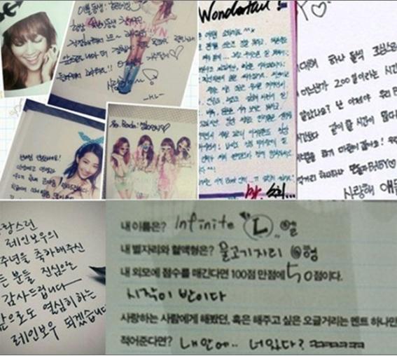 공개된 사진에는 미쓰에이, 레인보우, 빅뱅, 원더걸스 멤버들의 반듯한 글씨체가 눈에 띈다.