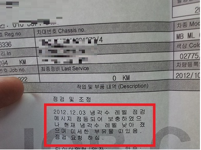 실제로 한 씨의 벤츠 차량 냉각수에는 쌀 알 크기의 흰색 부유물과 함께 기름기가 둥둥 떠 있는 상황이다.