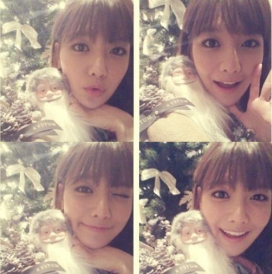 사진에서 수영은 산타클로스 인형을 손에 들고 귀요미 4종 세트를 보여주고 있다.