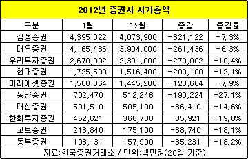 삼성증권은 1월 시가총액 4조3천억원으로 시작했으나, 12월 현재 4조700억원으로 줄어 4.9% 하락했다. 대우증권의 시가총액은 4.1% 줄었든 3조9천억원으로, 연초 대비 2천600억원 증발했다.
