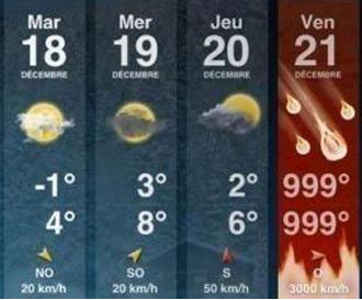 특히 지구 멸망의 날이라고 알려진 21일에는 눈·비 대신 불덩이와 유성이 그러져 있고 999도의 온도가 적혀있어 누리꾼들의 이목을 끌었다.