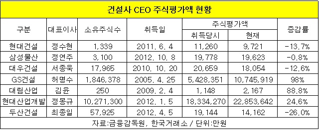 반면 현대건설과 삼성물산, 대우건설, 두산건설 등 나머지 회사 전문경영인들의 주식평가액은 오히려 줄어들어 울상이다.