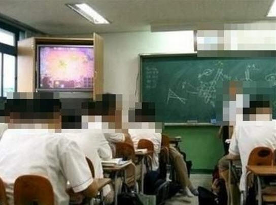 TV에서 나오는 프로그램은 인기게임 스타크래프의 방송중계이다. 즉, 학생들이 기발한 꼼수를 부려 선생님 몰래 게임프로그램 시청을 하고 있는 것이다.