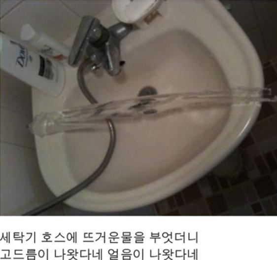 또한 게시물에는 "세탁기 호스에 뜨거운 물을 부었더니 고드름이 나왔다네. 얼음이 나왔다네" 라는 글이 쓰여 있어 웃음을 자아냈다.