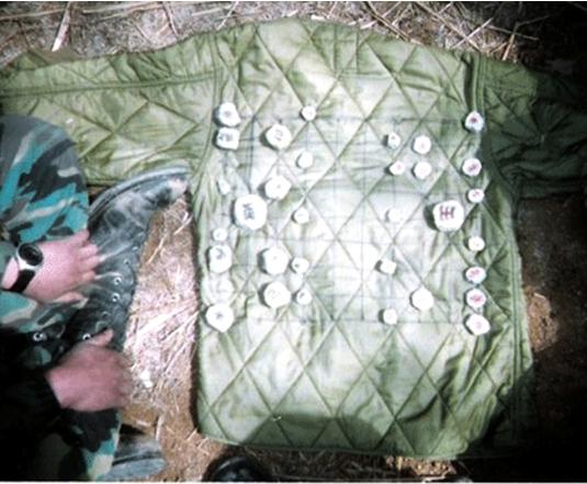 공개된 사진은 군인이 입는 옷인 일명 ‘깔깔이’의 등판에 장기판을 그림을 그려 장기를 두고 있는 모습이다.