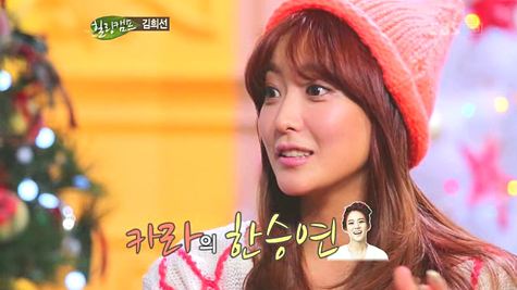 김희선은 이날 방송에서 “남편이 걸그룹을 그렇게 좋아한다"며 "이상형이 카라 한승연이다. 남편이 다니는 헬스클럽에도 카라도 다닌다”고 폭로했다. 이에 출연진들은 김희선 남편과 전화연결을 시도했고 박주영 씨는 "카라가 다닌다는 소식를 듣고 더 열심히 다니긴 했다”고 말해 웃음을 자아냈다.