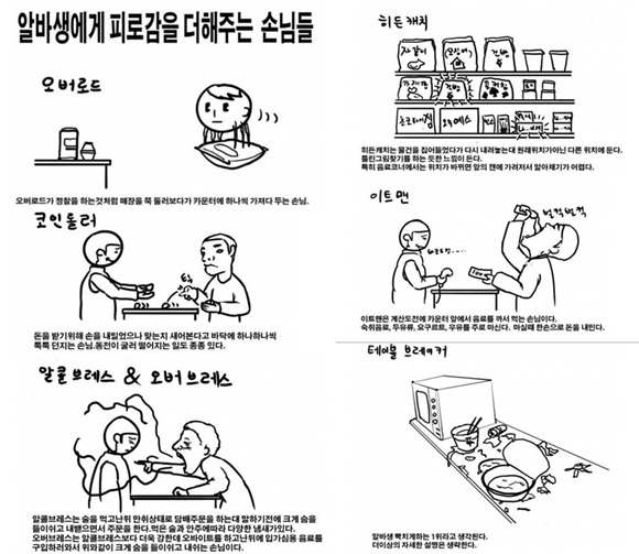 공개된 게시물은 편의점 아르바이트생에게 피로감을 더해주는 진상 손님들의 유형이 잘 나타나 있다. 게시물 속에는 정찰을 하는 것처럼 매장을 쭉 둘러보다가 카운터에 하나씩 가져다 두는 손님, 돈을 새어본다고 바닥에 하나하나씩 툭툭 던지는 손님, 술을 먹고 난 뒤 만취상태로 입냄새를 풍기는 손님, 줄서서 계산 하는데 끼어드는 손님 등 다양한 모습이 담겨 있다.