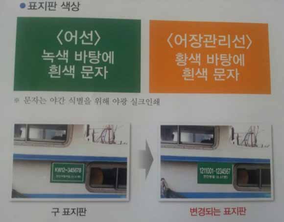 2013년부터 모든 어선은 전국단위 어선표지판으로 단일화된 표지판을 부착해야한다.