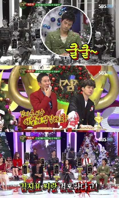 바로 직전에는 기상캐스터 박은지가 가수 김진표를 닮은 첫사랑 이야기를 하고 있었다. 김지훈은 “가슴이 따뜻해지는 이야기였다”며 엉뚱한 대답을 했다.