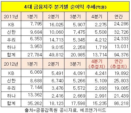 4대 금융지주는 올 1분기만 해도 3조5천262억원의 순이익을 기록하며 지난해 하반기의 부진에서 벗어나는 듯한 모습을 보였으나, 이후 순이익 총액이 2조원을 크게 밑돌며 매 분기 감소하는 모습을 보였다.