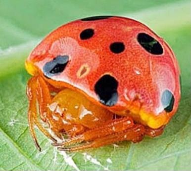 사진 속 위장술 쓰는 거미는 얼핏 보면 무당벌레로 보이지만 자세히 살펴보면 거미줄이 달려있어 거미인 것을 알 수 있다.
