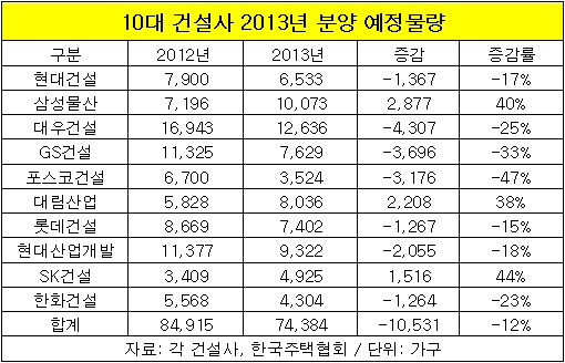 국내 10대 건설사의 2013년도 신규 아파트 분양이 올 겨울 한파만큼이나 차갑게 얼어붙을 전망이다.