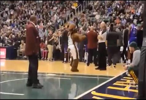 해당 영상은 NBA 경기 도중 경기가 잠시 중단 된 틈을 타 심판과 마스코트가 서로 신경전을 벌이는 것으로 시작한다.