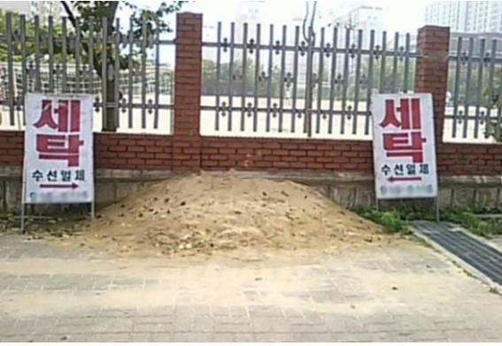 공개된 사진에서 세탁소 입간판 두 개가 가리키는 곳에는 세탁소가 아닌 흙무덤이 자리잡고 있어 의아함을 자아낸다.