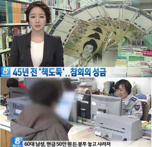 45년 전 책도둑 사연에 대해 경찰 관계자는 "책을 훔쳤던 죄책감을 수십 년 동안 느끼고 살아온 것만으로도 충분한 죗값을 치른 것 같다"며 "남성이 맡긴 돈은 좋은 곳에 사용되도록 국고로 귀속시켜 규정에 따라 처리할 방침"이라고 밝혔다. (사진-SBS)