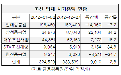 이에 비해 STX조선해양과 한진중공업은 올들어 시총이 30% 이상 줄어들어 대조를 이뤘다.