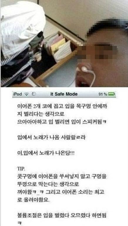 이 남성은 "코에 이어폰을 꽂은 채로 입을 목구멍 안까지 벌린다는 생각으로 '으아아아'하고 벌리면 입이 스피커처럼 된다"고 전했다.