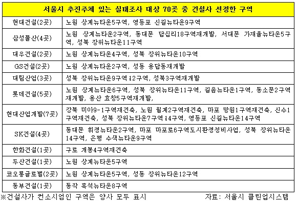 27일 건설업계에 따르면 현재 시가 진행 중인 실태조사 대상 70곳 중 29곳이 시공자를 선정, 건설사마다 적게는 50억원 이상의 비용이 매몰될 위기에 놓인 것으로 추산됐다.