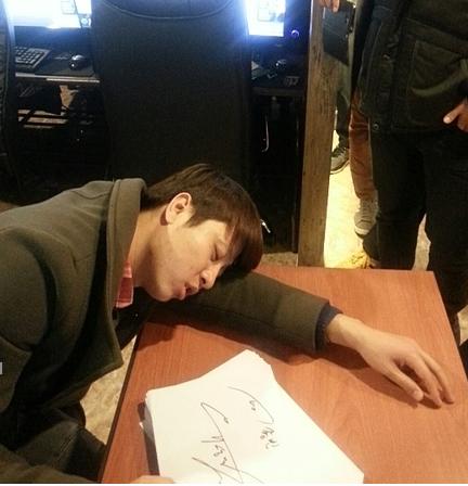 공개된 사진 속 유상무는 PC방 한켠에 마련된 책상 위에서 사인을 하다가 엎드려 입을 벌리고 잠든 모습이다.