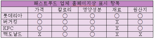 실제 국내 패스트푸드 업체 4곳(롯데리아, 버거킹, KFC, 맥도날드)의 홈페이지를 직접 확인한 결과 롯데리아가 5가지 항목 모두 빠짐없이 내용을 기재해 가장 충실한 정보를 제공하고 있었다.