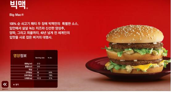 반면 맥도날드는 칼로리와 영양성분은 표기되어 있지만 가격과 원산지, 재료 등 가장 기본적인 정보마저 누락하고 있었다.