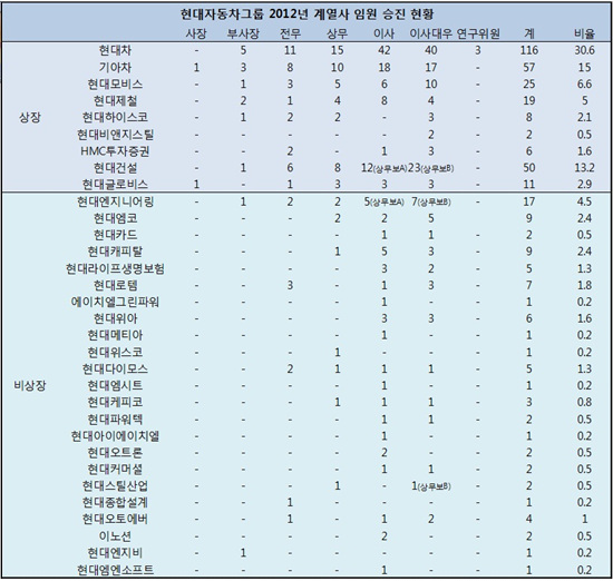 현대차그룹이 지난 28일자로 실시한 2013년도 정기 임원 인사에서 현대차 116명, 기아차 57명, 현대모비스 25명 등 총 379명의 승진자가 나왔다.
