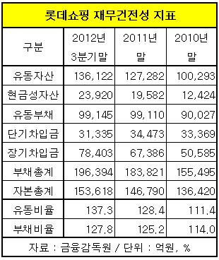 자금유동성도 안정적이다. 롯데쇼핑의 유동비율은 지난해 3분기말 현재 137.3%로 2010년 111.4%에서 2011년 128.4%로 해마다 좋아지고 있는 추세다.