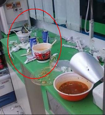 공개된 사진은 편의점 간이 식탁 위에 남은 컵라면부터 음료수 캔 등 각종 쓰레기들이 가득 펼쳐져 있어 보는 이들의 눈살을 찌푸리게 한 것.