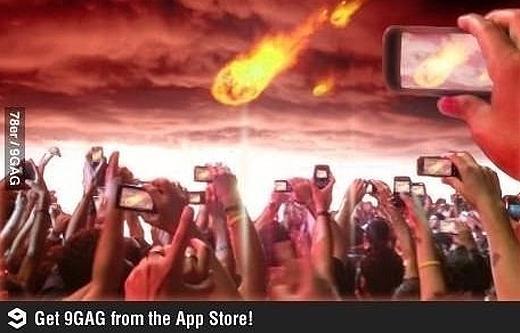 공개된 지구 멸망 2초 전 사진은 지구 멸망의 순간을 스마트폰으로 촬영하고 있는 사람들의 모습이 담겼다. 스마트 폰에 빠진 현 세태를 풍자한 것.