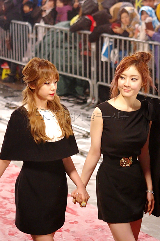 그룹 티아라 지연과 아름이 29일 저녁 서울 안암동 고려대학교 화정체육관에서 열린 ‘2102 가요대전 THE COLOR OF K-POP’ 레드카펫 행사에 두 손을 잡고 참석하고 있다.