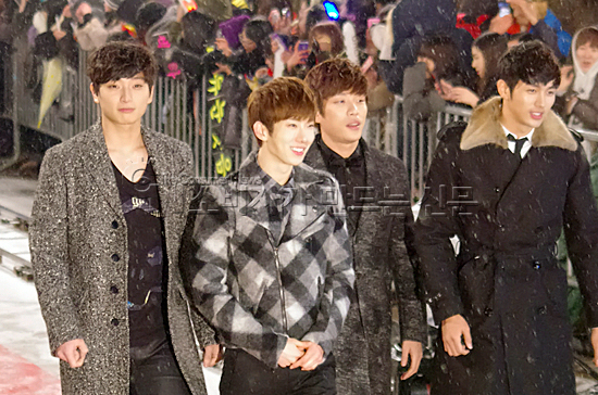 그룹 2AM이 29일 저녁 서울 안암동 고려대학교 화정체육관에서 열린 ‘2102 가요대전 THE COLOR OF K-POP’ 레드카펫 행사에 눈을 맞으며 참석하고 있다.