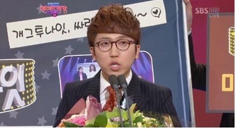 앞서 2012 SBS 연예대상에서 코미디 부문 최우수상을 수상한 정현수는 “‘개그투나잇’은 경쟁 프로가 '심야토론'과 영국 프리미어리그 박지성, 기성용 경기"라며 "기성용이 출전하면 시청률이 떨어진다. (기성용이) 부상을 당해야 하는데 우리나라 사람이라 그렇게 좋아하면 안 될 거 같다. 제 코너가 새벽 1시45분에 하던데 아무튼 조금만 빨리 이동을 했으면 좋겠다”고 소감을 말했다. (사진=SBS 연예대상 캡처)