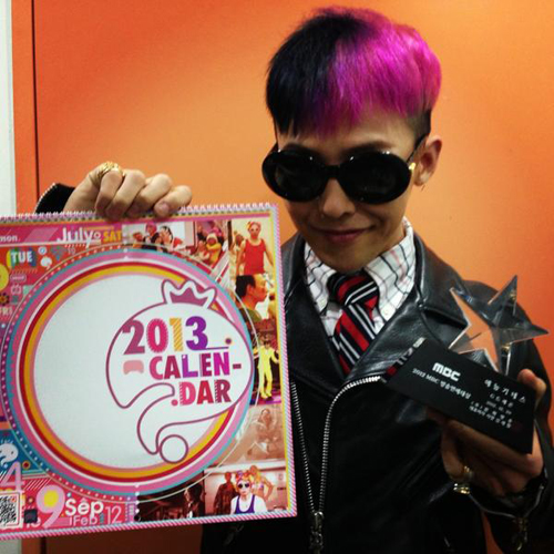 사진 속 지드래곤은 MBC '무한도전' 달력과 '2012 MBC 연예대상 스타일 기네스상' 트로피를 들고 미소를 짓고 있다.