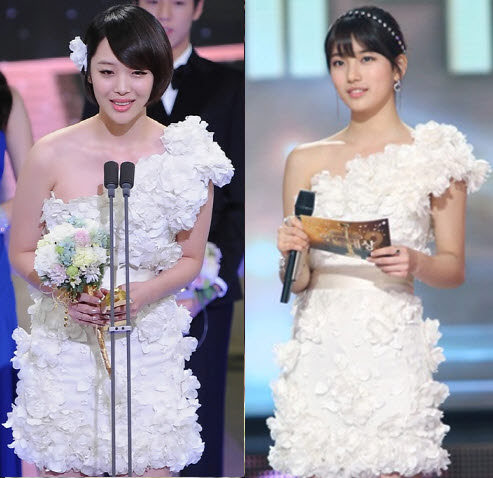 이에 앞서 수지도 지난달 22일 서울 여의도 KBS 신관 공개홀에서 진행된 ‘2012 KBS 연예대상’에서 설리와 같은 화이트 미니드레스를 입었다. 수지는 뱅스타일의 올림 머리를 하고 헤어밴드를 착용해 보다 정숙한 이미지를 드러냈다.