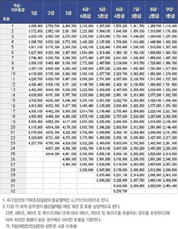 공개된 공무원봉급표2013에는 1급부터 9급까지 1호봉부터 32호봉까지 순차적으로 담겨있다. 별도의 수당은 제외된 금액이다.