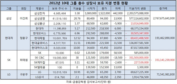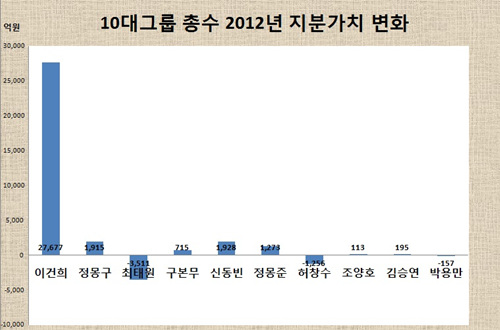 이건희 회장은 주식 가치가 2조7천677억원이 올라 10대 그룹 총수의 총 지분 가치 상승액의 96%를 차지했다. 10대 그룹 총수의 지분 평가액 중 이건희 회장이 차지하는 비중도 지난해 초 36.5%에서 12월 말 43.2%로 상승했다.
