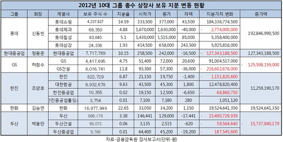 이밖에 롯데그룹 신동빈 회장은 롯데쇼핑 주가가 12.5% 오른 덕에 재산이 2천억 가량 늘었고, 현대중공업 대주주인 정몽준 의원은 1천273억원, 한화그룹 김승연 회장은 195억원, 한진그룹 조양호 회장은 113억원의 지분 가치 상승을 기록했다.
