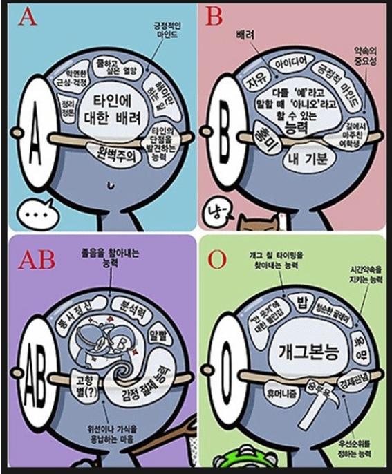 강한 개그욕구를 가진 O형은 휴머니즘과 승부욕이 강하다. 반면 AB형은 감정절제, 봉사정신이 강하고 분석력이 뛰어나다.